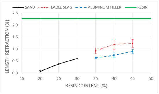 The pure resin results for all of the following tests are depicted as a continuous line as a reference. In this case, the resin plastic shrinkage was 2.263%. The sample plastic shrinkages were lower than the control resin value, and showed a direct relationship with the resin content. The lowest length plastic shrinkage values were obtained in the sand combinations within the 0.067%–0.604% range, probably due to the lower resin dosages needed for this target. Sand also showed the lowest result variability, with standard deviations (σ) between 0.026 and 0.044. The highest length plastic shrinkages and variability values were obtained by the LS combinations with ranges of 0.917%–1.235% and 0.118–0.191, respectively. Finally, the AF samples reached plastic shrinkages between 0.640% and 0.898% with σ values between 0.031 and 0.088. This test shows the importance of the use of target materials for the PPC length plastic shrinkage decrease, because of the reduction of resin content in the PPC. The length plastic shrinkage differences and the results’ variability highlights the influence of the target granulometry in this PPC characteristic.
