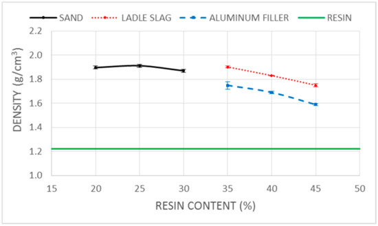 The cured PPC densities are shown in Figure 4. An increase in the sample densities was observed from 1.220 g/cm3, corresponding to the resin, until 1.870–1.912 g/cm3 for the sand, until 1.749–1.902 g/cm3 for the LS, and until 1.589–1.749 g/cm3 in the case of the AF combinations. The sand samples showed very low-density differences for the different resin dosages, with a maximum observed density of 1.912 g/cm3 for the 25% resin dosage. On the other hand, AF and LS showed an indirect relationship between the samples’ cured densities and the resin content. Thus, the LS densities varied between 1.749 g/cm3 for the LS-45 combination and 1.902 g/cm3 for LS-35, and the AF samples varied between 1.589 g/cm3 for AF-45 and 1.749 g/cm3 for AF-35. The sample densities showed, in general, low standard deviations (σ) in the range of 0.007–0.016 for the sand, 0.004–0.013 for the LS, and 0.008–0.030 for the AF. Different density relationship trends were observed between the sand, as well as between the LS and AF resin content combinations. This suggests that the resin does not only fill the interparticle pores, but also produces a partial substitution of target particles, thus decreasing the sample density. This highlights the complexity of the relationship between the bulk target material densities, their particle sizes, the optimum mixes resin dosage ranges, and the PPC densities.