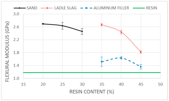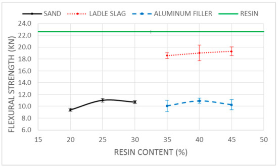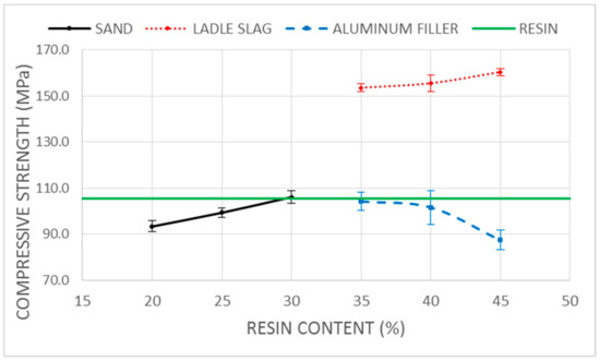 For the sample manufacturing, the resin and target were carefully mixed using an electrical mixing drill for five minutes. The catalyzer was then added, and the mix was mixed again for an additional five minutes in order to guarantee complete homogenization. After that, the mixture was filled in prismatic 40 × 40 × 160 mm molds coated with a mold-release agent. The fresh samples were vibrated to eliminate air, as well as for the correct filling of the molds. The samples were prepared by changing the resin content by 5% in the mass of the total sample, to state the optimum resin dosage range for each target. After preparation, the samples were maintained at room conditions for 1 h before demolding. A 24 h cure in an oven at 40 ºC was carried out to guarantee the complete polymerization of the resin and the curing homogeneity of all of the samples. Finally, the samples were maintained at room temperature for seven days before testing. Each combination was encoded by letters that identified the aggregate type (S for sand, LS for the ladle slag, and AF for alumina filler), followed by the resin content, expressed as a mass percentage of the total mix. Samples with no target materials were manufactured as a reference and were identified as resin.