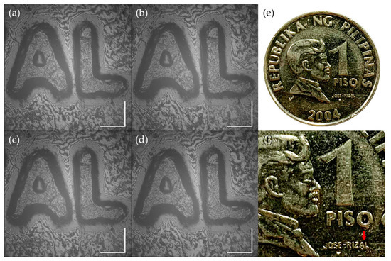 A set of four interferograms of a Philippine one peso coin, acquired at a depth during one complete period of phase modulation. The images (a–d) correspond to E1, E2, E3, and E4 of Equation (1), respectively. Two letters, A and L, are identified with the red arrow in (f), an enlarged image of the photograph (e). The imaging plane is the bottom of the coin surface. White scale bars: 200 μm.