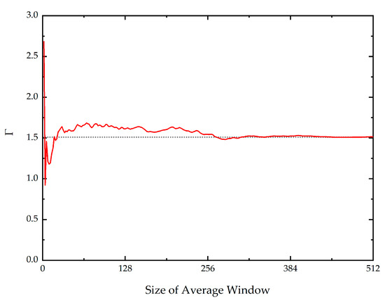The correction factor Γ, extracted from the intermediate images of Figure 3, calculated using Equation (13), by taking the area averages with a different window size. The result varies rapidly at the beginning, but smoothly converges to 1.51 as the window size increases.