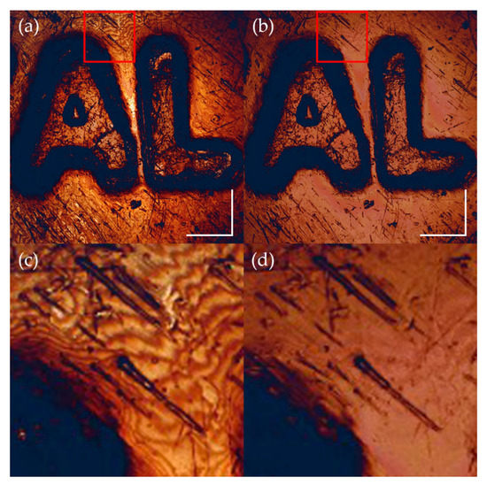 The intermediate images, (a,b), calculated by taking squares of Equations (8) and (9). There are interference fringes at the bottom surface and the letter regions are dark. Furthermore, the difference in brightness between the two images is severe. White scale bars: 200 μm.