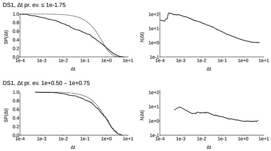 of the second-to-last occurrence, with respect to the last event, is about 1.5. In this case, the appropriate survival probability function is represented by the solid line and, in that portion, the Poissonian probability would be represented by the dashed line. In this case, the two lines are almost indistinguishable. We can also suppose that no event occurred up to now, and that the time elapsed from the last event is