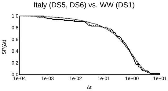An actual application is Italy. The historic Italian catalog CPTI15 is probably the best one in the world; unfortunately, being the best does not ensure that it is good enough. It is very rich, but not complete, dating back to about 1600. Thus, it is quite obvious that we cannot use it at face value. However, since earthquakes are self-similar, we can try to prove that the worldwide survival probability general function can be applied to the Italian events. On the basis of DS6, I created 106 datasets with randomly picked magnitudes, according to a Gaussian distribution, based on the catalog magnitudes and relative standard deviation. The obvious assumption was that all (or most) of the M ≥ 6 earthquakes are, in fact, contained in CPTI15, but that the magnitudes are either over- or under-estimated. The randomized datasets contained between 55 and 92 events each. I discretized each logarithmic decade into 20 bins, instead of directly using the observed . Then, I computed the survival probability function for each dataset, stacked it, and finally averaged it. As the event number was not constant, the most significant portion of the averaged survival probability function was where events tended to concentrate, that is, in the range between 0.1 and three.