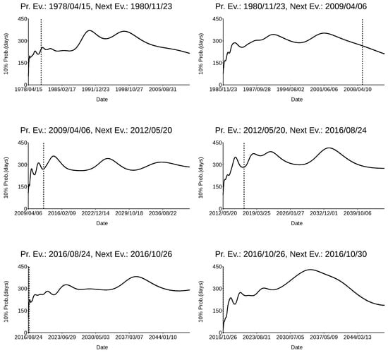 Table 1) is shown. I limited this analysis to the last seven, since there were only eight major events with M ≥ 6.00 for which a CMT magnitude estimate was available, and the method I propose requires at least two events to estimate the occurrence probability of the next one. The event rate is calculated for each event on the basis of DS5—the validated CPTI15 dataset—excluding the more recent, yet to occur, events. The occurrence timing of the next event is shown with a dashed vertical line. It is noteworthy that the events all occur during graph minima, which actually correspond to increased probability time intervals. This means that, according to this pattern, the next event will likely occur either in the next few months, during spring–fall 2022, or after 2035, the latter two being highlighted by gray areas. It is obvious that we are simply discussing probabilities and that events can occur even with a highly improbable timing; nevertheless, we have an indication.