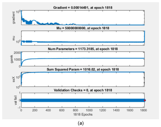 A regularized training function was selected to solve the overfitting problem. The applied parameters are listed in Table 3. The BPN achieved convergence when the momentum peaked or the sum squared error (SSE) remained unchanged. As presented in Figure 5, the SSE remained unchanged, and peak momentum was achieved in the training state.