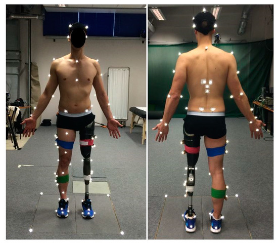 Reflective markers placed on a subject with transfemoral amputation; 47 markers were used in the present study according to the protocol described by Maldonado et al. [15].