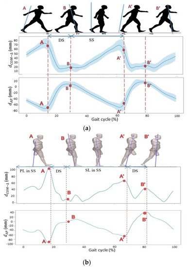 The plot of the distance between minimal moment axis and center of mass (COM) (, and the anterior-posterior component (, relative to the gait cycle, for the average of healthy subjects (a) and an amputee subject (b). (A: First Heel Strike, B: First Toe Off, A’: second Heel Strike, B’: second Toe Off, DS: double stance, SS: single stance, PL: prosthetic limb, SL: Sound Limb).