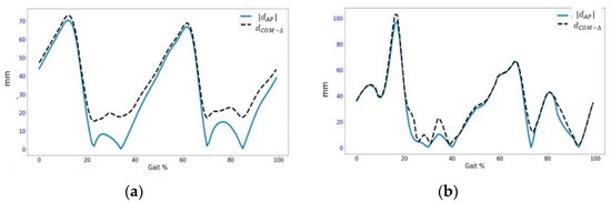 Evolution of the norm of the distance between minimal moment axis and COM ( dashed line and the absolute value of the anterior-posterior component full-line, during the gait cycle, for the average of healthy subjects (a) and one person with amputation (b).