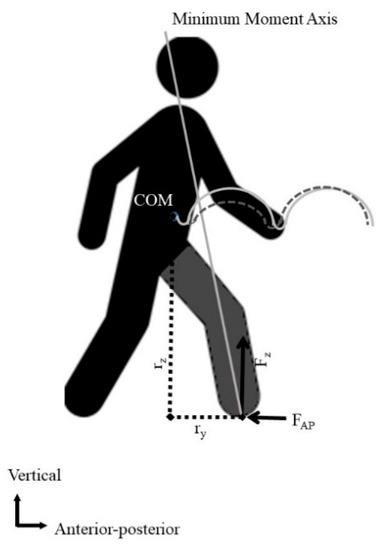 The above-mentioned parameters, shown schematically in Figure 5: the FFP, the COM height, the external forces and moments are all wrapped up in one significant parameter: the distance. The control of any mentioned parameter contributes to the control of the distance. Finally, the distance describes the angular momentum because the external moment is equal to the derivate of the angular momentum Equation (6). Our results are consistent with the ones of Popovic et al. who have proposed that the healthy subjects control the variation of the angular momentum [9].