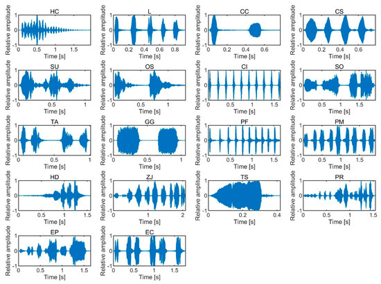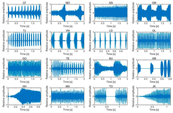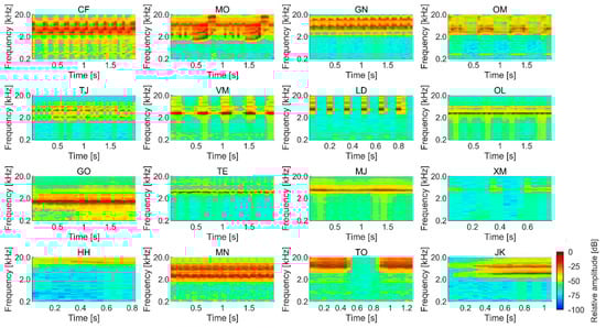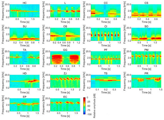 Since the guidelines [1] recommend a duration of 5 s or less for the sound signals, birdsongs and insect songs with one phrase less than 5 s were selected for subjective preference tests. We tested 18 types of birdsong that were recorded using a dummy-head microphone (KU100, Nuemann, Berlin, Germany) at a sampling rate of 48 kHz and a sampling resolution of 24 bits (WILD BIRDS, Victor, Tokyo, Japan). The birdsong stimuli are summarized in Table 1. Figure 1 and Figure 2 show the temporal waveforms and spectrograms of the 18 birdsong stimuli. We tested 16 types of insect song that were recorded using a linear pulse code modulation recorder microphone (LS-10, OLYMPUS, Tokyo, Japan) at a sampling rate of 44.1 kHz and a sampling resolution of 16 bits (Japan NatureSounds Guide, UEDA NATURE SOUND, Tokyo, Japan). The insect song stimuli are summarized in Table 2. Figure 3 and Figure 4 show the temporal waveforms and spectrograms of the 16 insect song stimuli. The duration of the stimuli was between 0.4 and 2.0 s.