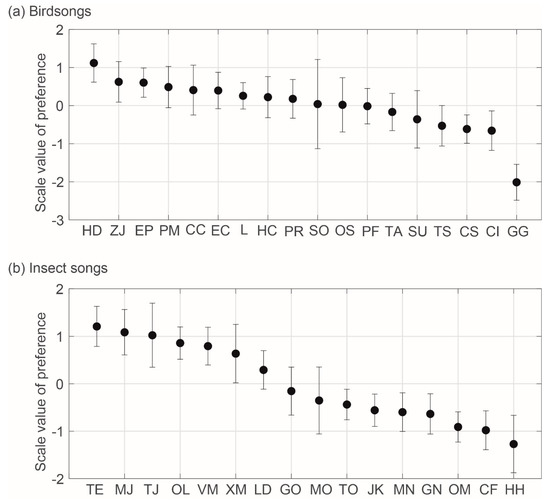 Scale values of preferences for (a) birdsong and (b) insect song. Each symbol indicates the mean value and error bars indicate standard deviations.