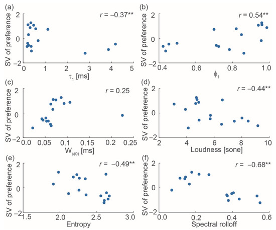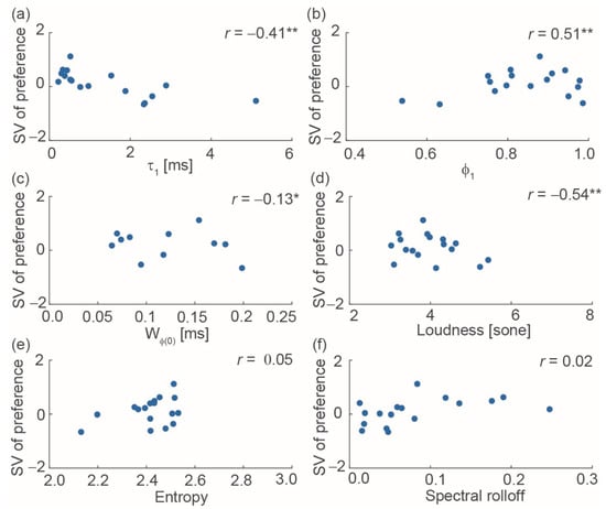 Relationships between physical parameters and scale values of preference for birdsong stimuli. (a) τ1, (b) φ1, (c) Wφ(0), (d) loudness, (e) entropy, and (f) spectral rolloff. The numbers represent correlation coefficient values. Asterisks represent the level of significance, i.e., ** p < 0.01, * p < 0.05.