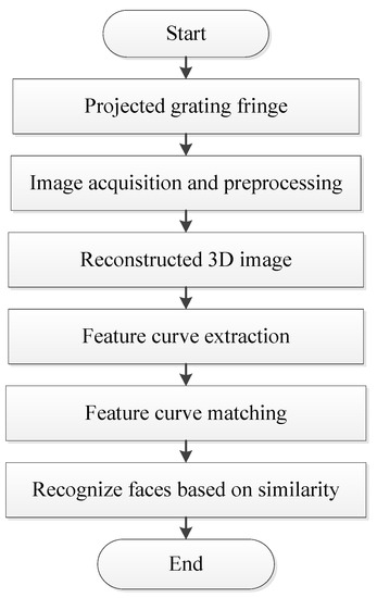 To recognize 3D faces, we must first preprocess the reconstructed 3D face images. In the study of image processing, a method of describing a digital image as a vector in terms of a frequency histogram of graphs and mapping the image into a vector space through a graph transformation is presented [4]. There is also a method in which an image is encoded by a region adjacency graph (RAG), based on multicolored neighborhood (MCN) clustering algorithm [5]. Three-dimensional face recognition is divided into two parts: measurement and algorithm. As an important three-dimensional measurement method, grating projection measurement has the advantages of noncontact, low cost, and high precision and is widely used in industrial detection, reverse engineering, biomedicine, virtual reality, and other fields [6,7]. The projected grating phase method was first proposed by Tskeda [8] in 1982. Information on object height is obtained by demodulating the fringes that are previously modulated by the height on the surface of the object in this method. Common fringe projection measurement techniques include phase measuring profilometry (PMP) [9,10], Fourier transform profilometry (FTP) [11], and Moire profilometry (MP). Compared to Fourier transform profilometry and convolutional demodulation, phase measurement profilometry requires more fringe patterns and slightly longer acquisition time. However, PMP has advantages such as a simpler solving process, fewer computations, and a resistance to the background influence. The method directly finds the phase value in fringe patterns through mathematical calculations, and thus, we use PMP for the wrap phase in fringe patterns. The frequency of phase shifts determines speed and accuracy. Fewer phase shifts lead to a faster speed, but the accuracy is lower. Accordingly, more phase shifts help improve the accuracy it may reach, but the speed is slower. Considering the two factors of speed and accuracy, we use a four-step phase-shift method as the demodulation method of the fringe phase. We use an improved Goldstein branching method for a better quality of phase unwrapping patterns and achieve practical significance for the accuracy of 3D reconstruction in human faces.