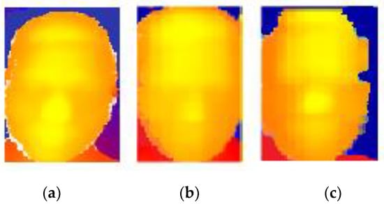 It can be seen that when the number of fringes is 32, the projected image is not deformed, and a 3D face image with better quality is obtained; however, some details are missing in the image. When the number of fringes is 128, there are too many fringes in the projected image, which causes its deformation, and thus, the obtained 3D face image is severely deformed. When the number of fringes is 64, the projected image is not deformed, and the quality of the 3D face image is the best among the three images, with more details recovered in the human face. These details can make 3D face feature positioning and recognition more precise. Therefore, we chose the fringe pattern with 64 fringes.