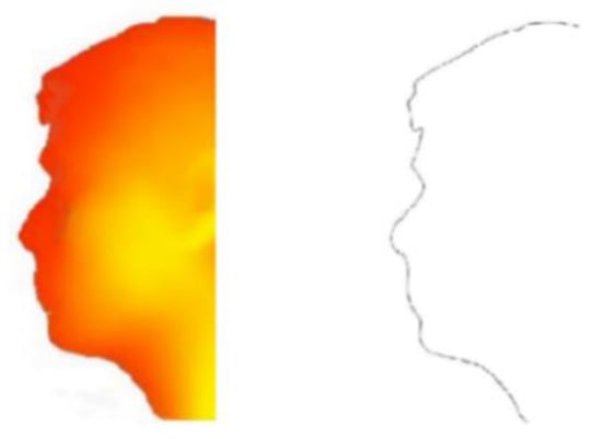 A 3D face image cannot contain all face information due to the difference in camera shooting angle and face posture change, which results in the lack of certain features in the face and affects the accuracy of recognition. The side contour of the face is the contour of the front end (highest height) when the face is facing sideways. It contains rich facial features and can represent the main features of the face compared to other characteristic curves [24]. There are certain differences between the side contours of different people, so using the face contour for face recognition achieves higher reliability and stability, as shown in Figure 6. The position of the side contour is determined according to the position of the two inner eye corners because the root of the nose is located in the center of the two eyes. The side contour is extracted according to the position of the tip of the nose and the root of the nose.