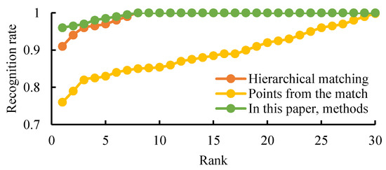 When the layered matching is used for rank recognition alone, the recognition rate is 91.5%. Additionally, when the point-distance matching is used for rank recognition alone, the recognition rate is 76.5%. The layered elastic matching contains the local and global features of the curve, but since the method only uses the two-dimensional coordinate information of the sampling points and discards their one-dimensional information, the recognition rate is not ideal. The point-distance matching further uses the spatial distance of the sampling points relative to the nose-tip point. The recognition rate here may be lower, but it retains the spatial three-dimensional information well, which helps in the shortcomings of layered elastic matching. In this paper, we use a combination of point-distance matching and the layered elastic matching and obtain a higher recognition rate. The cumulative match characteristic (CMC) curves of the three experiments are shown in Figure 15.
