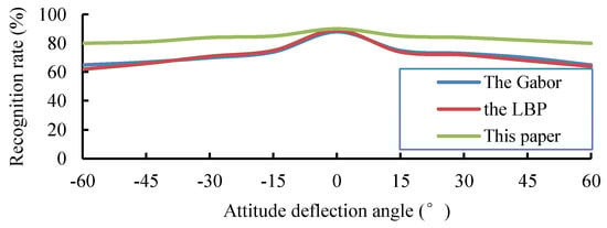 In the experiment, we considered images in different attitudes. It can be seen from Figure 16 that the overall recognition rate of the proposed method is higher than that of the Gabor-based face recognition method [28] and that of the LBP algorithm [29].