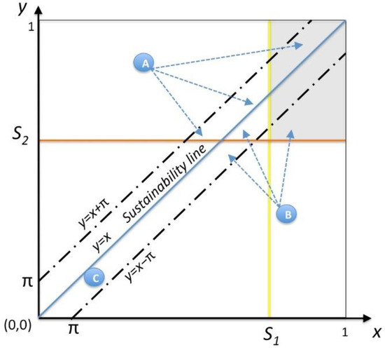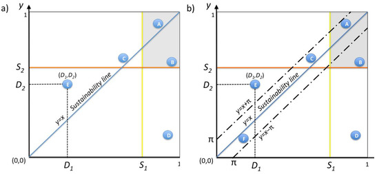 Having explained the notion of city smartness let us define the notion of sustainability in the context of cities. Intuitively, sustainability means that the set of dimensions of the city D = {D1, D2, …, Dr} is balanced, meaning that the values D1, D2, …, Dr are similar, i.e., D1 D2 … Dr. In the ideal case D1 = D2 = … = Dr. For 2D space, such a case is represented by a straight line whose equation is . We dub this line a sustainability line, that is, a line of equilibrium perfectly balanced between the domains. This line can be found in Figure 1a. Thus, sustainable cities should find themselves as close to this line as possible. To describe this observation formally, we constructed a “corridor” that forms a neighboring area to the sustainability line, and is constrained by two straight lines lying above and beneath the sustainably line and that keep the same distance from it. Let denote the sustainability distance. The equations for the straight lines determining the corridor are: