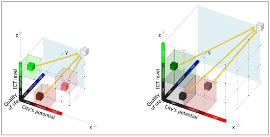The essential and simplified variant assumes that within the system of the proposed smart city cube, the analyzed city has a defined, fixed place in the adopted coordinate system. This suffices for many applications and evaluations, as this model can be used, for example, to compare the development of different cities at any given moment. However, when establishing a long-term strategy for the city’s development, it may be necessary to adopt a more sophisticated solution.
