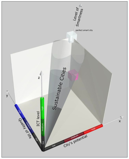 The cities depicted in yellow, purple, and blue solid objects (Figure 4b) cannot be called entirely smart because at least one of the components was at a low level. The city represented by the grey cube was on the smart path, namely, in its developing phase. For a utopian super-smart or perfect smart city (the white dot on Figure 4b), all components reached the equal and maximum level of the contemporary enlightenment, which, using the analogy of the RGB color space, was white. One may note that not all of the cities have to reach this level; some will never reach it because of their external conditions. It may be enough for them to become sustainable organisms staying inside the cone, although only in its dark grey part. It is up to the city’s authorities to assess the current position of their city and to draw its development path, not necessarily one ending in the utopian White Dot City.