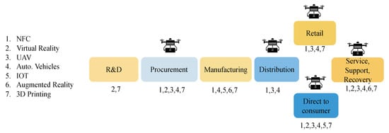 In Figure 1, we show how these technologies participate in the supply chain; UAVs can perform in various processes. UAVs help to count products in the warehouse, to monitor work and are also used for the collection of products that must be returned to the production center. UAVs have a greater influence in the distribution due to their unique characteristics, which are delivering quickly, safely, and autonomously. Furthermore, these vehicles pollute less than trucks and represent a cost saving, therefore, service companies are considering them for their distribution to improve their service.