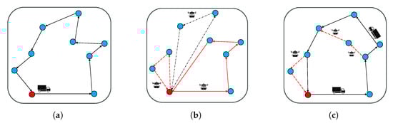 The first approach (Figure 2a) is the traditional approach in which a delivery truck visits all customers, but a second scenario (Figure 2b) can be observed taking into account an emerging technology. This is known as a modern approach, where delivery UAVs visit all customers and, finally, you can have a combination called a mixed modern approach Figure 2c, where UAVs and delivery trucks visit all customers.