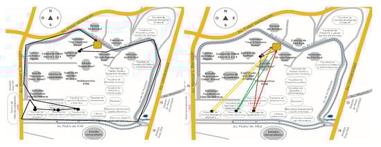 In Figure 2, the three approaches that were handled in the experiments are shown according to the allocation of the vehicles to satisfy each client; in this case, they are faculties and departments of the UANL.