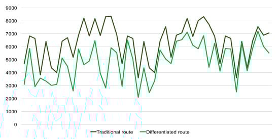 In the experiments, CO was also analyzed in the routes, INECC [31] describe the truck used in the experiments generates 255 g/km of carbon dioxide, a comparison of the mileage saved when using drones was made, the comparison is presented in Figure 5.