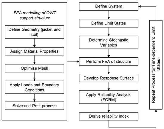 In a conventional structural analysis, the environmental loads, geometric dimensions, material properties, and parameters are treated as deterministic quantities, which are often expressed in the design through characteristic values incorporating partial safety factors for consideration of uncertainties. This type of analysis is adequate in cases where randomness is relatively small. However, structures used for offshore deployment are generally complex and subjected to high uncertainties introduced by the environment, manufacturing, and operational processes. Randomness in design parameters for such systems should be systematically accounted for via stochastic modeling, allowing for a better informed and potentially optimized design that would take into consideration the life cycle of the structure and associated time-variant mechanisms of damage. Reliability analysis enables an efficient approach to better understand the response of the system to variation of an input parameter, enabling the systematic modeling of uncertainties occurring from highly complex models, loading conditions, etc. [19]. In particular, for offshore jacket foundations, soil-structure interactions and particularities of marine environments introduce considerable uncertainties (e.g., soil properties, wind, wave, and current loads, etc.), leading to the requirement of employing proper reliability analysis methods. A structural reliability model of OWT support structures requires two key components, i.e., (1) a structural model describing the structural behavior of OWT support structures, and (2) a suitable reliability assessment method which finds the reliability index (or the probability of failure ) of critical members with respect to the constraints [20].