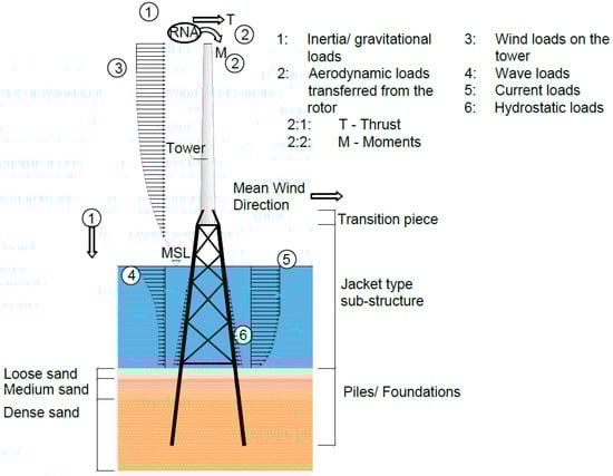 OWTs are exposed to several load sources usually imposed by their environment. In design codes, such as DNV-OS-J101 [71] and IEC 61400-3 [72], loads which are relevant to the design of OWT jacket support structures are outlined. Calculations and formulations of each load produced by the environment in this study are based on DNV-RP-C205 [73]. The loads relevant to OWT support structures can be roughly classified into six groups, i.e., (1) aerodynamic loads transferred from the rotor, (2) wind loads on the tower, (3) inertia loads, (4) current loads, (5) wave loads, and (6) hydrostatic loads [24]. These loads are illustrated in Figure 2.