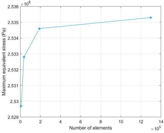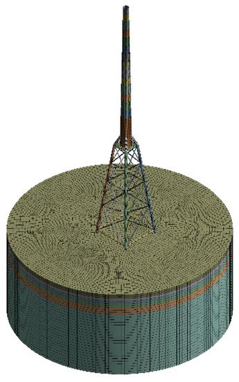 In order to ensure accuracy of results, a mesh sensitivity study was carried out [1,24]. This is depicted in Table 4 and Figure 3. From the mesh sensitivity study, the equivalent (von Mises) stress converged at the mesh size of 2 m for the soil and 0.5 m for the support structure, corresponding to a total number of elements of 190,222. Therefore, 2 m and 0.5 m are deemed as appropriate mesh sizes for the soil and the support structure, respectively. As can be observed, the maximum displacement and buckling load multiplier are not sensitive to change in mesh size. The generated mesh for the FEA model is depicted in Figure 4.
