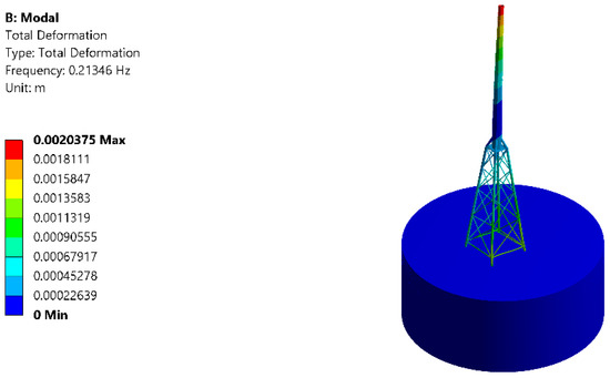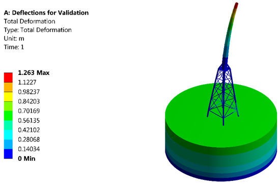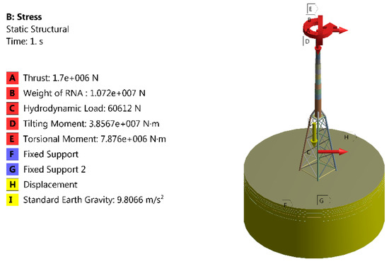Aerodynamic loads are dynamic and static loads resulting from the airflow interaction with the moving and stationary wind turbine components. The load magnitude varies, and this depends on the air density, the mean wind speed and turbulence across the rotor plane, and the aerodynamic shapes of the components of the wind turbine and their interactive effects. These loads can be computed using aeroelastic models [74]. The aerodynamic loads imposed by the rotor are transmitted to the top of the tower and are usually decomposed into a load matrix defined in the referential axis of the wind turbine. The fatigue loads were determined by employing the damage equivalent load (DEL) method, which was described in Reference [75]. The support structure was subjected to thrust load directed along the diagonal of the jacket base and applied at the assumed RNA center of mass (CM). This loading set-up resembled a yaw error situation and produced an additional torsional moment at the tower top. The presence of a horizontal offset for the RNA CM led to a gravity moment at the tower top [8]. Wave load and rotor thrust vectors were directed along the jacket base diagonal, causing maximum compression and tension on the opposite legs [5].