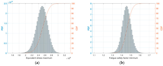 In this study, the six sigma analysis function of the DesignXplorer© module in ANSYS is used for the probabilistic assessment. Latin hypercube sampling (LHS) with number of samples equal to 1 × 107 is defined and applied to all the design constraint cases. The cumulative distribution function (CDF) is used to assess the probability of failure and, hence, the reliability of the component. The cumulative distribution function value at any given point expresses the probability that the respective parameter value remains below that point. Whether this probability represents the failure probability or the reliability of the component depends on how failure is defined [53]. The corresponding reliability index is evaluated through appropriate statistical transformation [55].