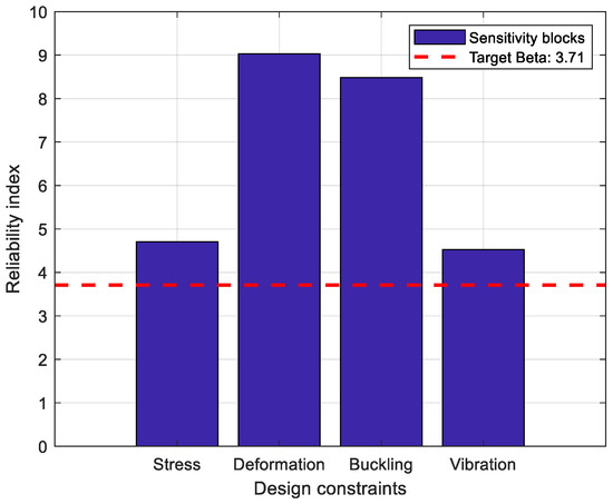 where () are 17 regression coefficients for a quadratic regression. For other types of constraints, i.e., deformation, buckling, vibration, and fatigue, expressions similar to Equation (5) can be derived. Multivariate regression can be used to obtain the regression coefficients for different limit states [49].