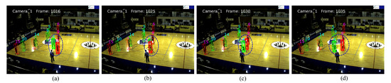 For one location (i.e., one player), it might correspond to several bounding boxes cropped from different cameras. Thus, the appearance feature can be jointly determined based on these cropped images, which can avoid some interferences caused by occlusions to some extent. The appearance feature used in this paper is the jersey color and jersey number. For the jersey color, assume the output of color feature for one cropped image can be represented as where {1 (yellow), 2 (blue), 3 (yellow and blue), and 4 (none)}, and p means its probability. Then, we need to fuse multiple color feature candidates into one, which can be considered as a vote issue that needs to determine which team the player should belong to. This problem can be easily solved by the classic Boyer–Moore voting algorithm [47]. Similarly, the jersey number as well as its probability can be obtained in the same way. However, it is worth mentioning that before the jersey number extraction for each cropped image, we need to ensure the player’s color label is the same as the winning color label after voting. If not, the jersey number might be wrong due to occlusion (see the player 3 in Camera 2 and 4 in Figure 5).