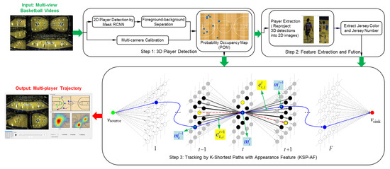 The pipline of the multiple-player tracking system based on the KSP-AF tracking method mainly consists of three parts: (1) 3D player detection [42], (2) feature extraction, and (3) tracking by k-shortest paths with appearance feature (KSP-AF). The input of the whole system is multi-view basketball videos, and the output is multiple player trajectories. For the KSP-AF tracking, the inputs are both of the 3D detections represented as POM data and the extracted features for each detection.
