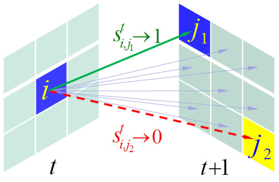 Figure 3 shows a simple flow model that people in location i at time t can travel to one of their neighboring locations at time . The blue nodes ( and ) represent players wearing blue jerseys; a yellow node () means a player who belongs to yellow team, while the jersey color of other nodes are unavailable. It is easy to know that the node is more likely to arrive at the node with the same jersey color, rather than the yellow node . And matching probabilities between other nodes whose features cannot be available would be the same as 50%. We call the link along the green arrow a strong match; the red arrow with dashed line means an impossible match; the other gray arrows represent possible matches. Thus, given the feature labels and their probabilities, we can define the similarity of two nodes as: