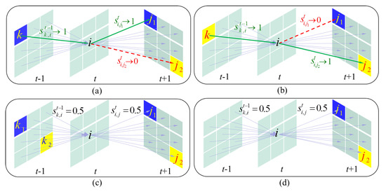 However, due to occlusions, some features (especially the jersey number) can be available only in very few frames. Sometimes, when the appearance feature at current time t is unavailable, the similarity between node and node would be set as the same. It means that the probabilities of the player in location i at current time t arriving at anyone of its neighbor location at the following time are the same, like the original KSP. In our proposed method, in order to make full use of the available features as much as possible, we also consider the neighboring nodes in the previous frame to help us discriminate more players when the feature can not be extracted in the current frame due to occlusion or low resolution. For example, when the jersey color in location i at time t is unavailable but can be known for one of its neighboring nodes in the preceding time , as shown in Figure 4a,b), we can compute the similarity between the preceding and following frame instead. However, if more than one node with its feature available could arrive at location i (see Figure 4c), or none of the neighboring nodes can be access to their feature (see Figure 4d) at time , we cannot match the node i and because the existing identity information is ambiguous or not enough to judge whether they should be connected.