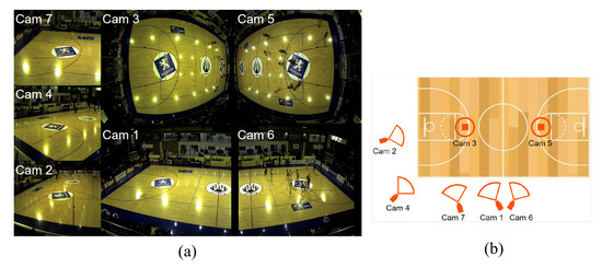 APIDIS basketball dataset is captured by five ground cameras around the court and two fish-eye cameras overhead of the court: (a) images captured from seven views; (b) the schematic diagram of camera installation.