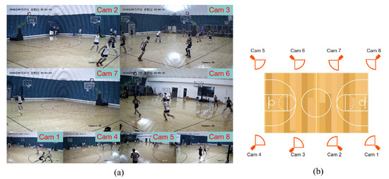 Our own STU basketball dataset is collected with eight ground cameras evenly distributed around the court: (a) images captured from eight views; (b) the schematic diagram of camera installation.