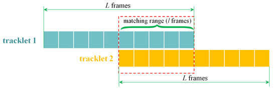 Connect two tracking segments according to players’ positions within the matching range of l frames. For example, suppose the batch size is set as L: both tracklet 1 and tracklet 2 contain L frames with l frames being overlapped. We call the overlapped l frames matching range frames. Then we calculate the distance between the two positions frame by frame within the matching range. If the distance is less than a given threshold, we call it a match. If not, a mismatch. Only if the matching number of times overpasses 80%, we then connect the two tracklets. Otherwise, we consider the current tracklet segment a new trajectory.