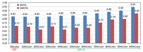 The comparison of MOTA and GMOTA scores between original KSP and our proposed KSP-AF in STU dataset: (1) 70%Color+50%Number is provided for KSP-AF tracking while original KSP considers neither of them; (2) both MOTA and GMOTA scores are clearly improved in KSP-AF compared to original KSP; (3) numbers in brackets are the frame lengths of each period respectively.
