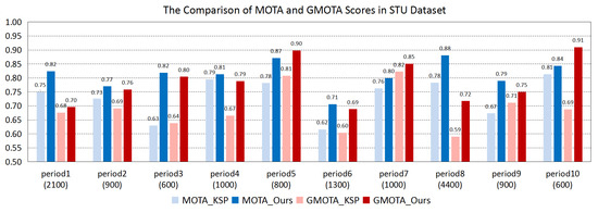 To further demonstrate the effectiveness of our method, the STU dataset collected by us is used; it includes 10 periods of sequences. We first use the original KSP to test, and then apply KSP-AF into the same sequences (with 70% jersey color and 50% jersey number). Figure 11 illustrates the comparison of MOTA and GMOTA scores among the ten periods of sequences, respectively. Numbers in brackets represent the frames length of each period, respectively. It is clear to see that, compared with the original KSP approach, both MOTA and GMOTA scores under KSP-AF obviously increase in each period. This means that our KSP-AF method with 70% of the jersey color and 50% of the jersey number can maintain the identity more steadily than the original KSP method.