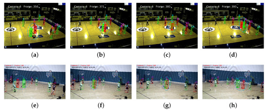 Suppose we can extract about 70% of the jersey color as well as 50% of the jersey number over the sequence; the proposed KSP-AF can better maintain the players’ identities compared with the original KSP method. Figure 12 illustrates the improved tracking effects using APIDIS and STU datasets based on KSP-AF. In Figure 12a–d), although two players annotated with thicker line (yellow player 4 and blue player 7) come very close to each other from frame 350 to 380, their identities remain unchanged in frame 393, which is impossible when the original KSP approach is applied in the same sequence. The same improvement can be seen in Figure 12e–h when the KSP-AF is used in our STU dataset.