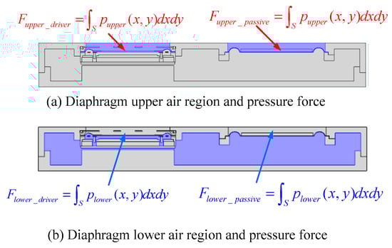 The lower part and upper part air pressure forces are defined as Flower and Fupper, respectively. Flower and Fupper are obtained by integrating the node pressure force over the diaphragm surface. The difference between the lower part and upper part air pressures is defined as Fair. The air-pressure force is depicted in Figure 5. In addition, a current force drives the unit, except for the air-pressure force. This current force is defined as Fcurrent. The total force acting on the vibration system is F. It is concluded that the total force influences the mechanical velocity. Therefore, the mechanical and acoustic domains are considered to be coupled with each other.