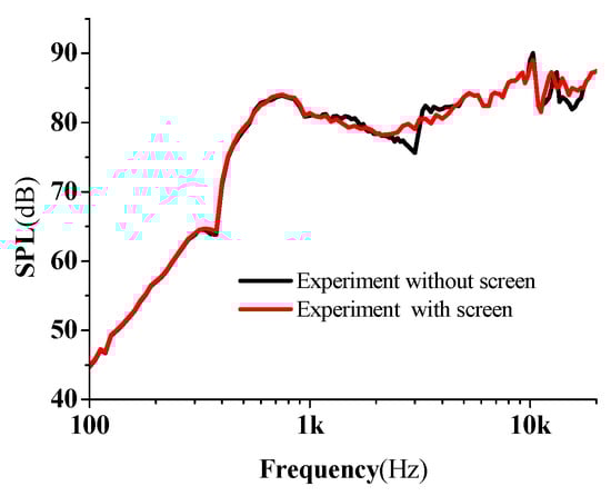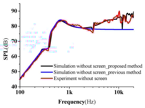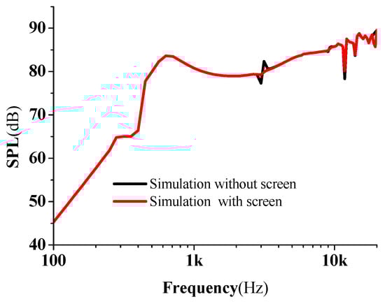 A simulation was run to determine the influence of the screen. The proposed method was used to consider the standing-wave effect. The simulation shows that the peak and dip in SPL is cancelled with the screen. The simulation result is depicted in Figure 13.