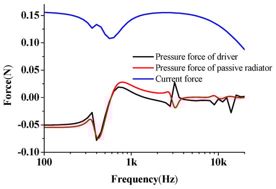 Figure 8 shows the sound-pressure distribution. The sound pressure under the driver diaphragm is at the minimum at 3000 Hz and at the maximum at 3150 Hz; the latter contributes to the peak in the SPL curve. Figure 9 shows the force curve in terms of the frequency domain. The current force is defined as the force caused by the input current in the coil. It is at a minimum around the resonance frequency because the current is at a minimum. The dip and peak of the pressure force at approximately 3000 Hz is because of the sound-pressure distribution in the enclosure. The detail explanation is listed in the following sentence.