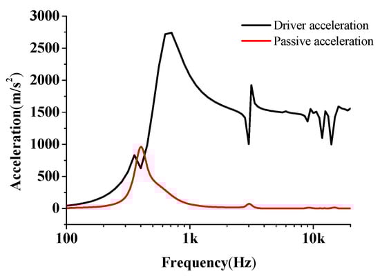 The total force acting on the driver is the summation of the current force and pressure force on the driver. The acceleration of the driver and passive radiator is demonstrated in Figure 10, based on the forces acting on them. The dip and peak remain at approximately 3000 Hz because of the acting force.