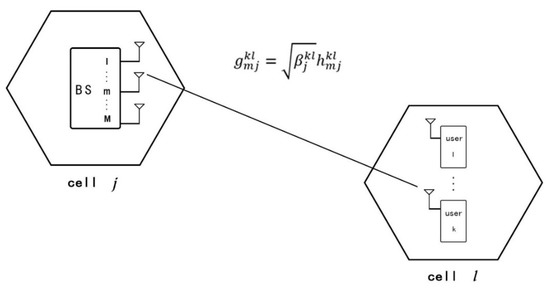 7]. The cell represents a regular hexagonal cell network. Each cell is equipped with a multi-antenna base station, and the base station can provide services to multiple users in the cell. The number of antennas of the base station is set to M, and each antenna is an omnidirectional antenna. The number of users in the cell is set to K, and each user terminal is equipped with an omnidirectional antenna. Accordingly, a cell constitutes a multi-user MIMO system, where K independent users can form a virtual antenna array with number of antennas K. The configuration of the base station and the user end constitutes a MIMO downlink system with the size of KM, or a MIMO uplink system with the size of MK. In the traditional single-user MIMO systems, the total rate capacity of the uplink and downlink channels of a multi-user MIMO system is proportional to min(M, K).